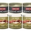 Vom deutschen Hersteller MACs stellen wir Ihnen hier das Nassfutter Kopffleisch & Karotten für ausgewachsene Hunde vor, bei dem es sich um ein getreidefreies Alleinfutter handelt, dessen hoher Fleischanteil von 70 % sich ausschließlich aus Teilen vom Rind zusammensetzt. Diese tierische Monoproteinquelle ist aufgeteilt in wertvolles Kopffleisch (30 %) sowie in Muskelfleisch und Innereien (Herz, Leber, Pansen und Lunge) und entspricht damit der natürlichen Zusammensetzung einer in freier Wildbahn erlegten Beute. Der hohe Gehalt an schlachtfrischem Fleisch (Formfleisch oder Fleischmehle werden nicht eingesetzt!) und das gleichzeitige Fehlen von glutenhaltigem Getreide garantieren dafür, dass Ihr Hund mit diesem schmackhaften und vollwertigem Hundemenue artgerecht und gesund ernährt wird, zumal auch künstliche Stoffe zur Konservierung, Färbung oder Geschmacksverstärkung nicht eingesetzt werden. Die von MACs in seinen zahlreichen verschiedenen Nassfuttern verarbeiteten fleischlichen Rohstoffe stammen fast ausschließlich aus der Produktion einheimischer Schlachtbetriebe und werden schonend verarbeitet, sodass der unverfälschte Fleischgeschmack und die wertvollen Inhaltsstoffe bewahrt werden. Durch den Zusatz von Karotten und Seealgen, die wichtige Vitamine liefern und Ballaststoffe für die Verdauung der tierischen Proteine sowie den Einsatz einer ausgewogene Mineralstoffmischung sorgt Kopffleisch & Karotten dafür, dass Ihr Hund optimal mit allem versorgt wird, was er jeden Tag für seine Gesundheit benötigt. Bei Zooheld, dem Spezialisten für abwechslungsreiche und hochwertige Tierfuttermittelmittel, können Sie außer diesem Nassfutter auch alle anderen Hundemenues von MACs günstig online bestellen, die durchweg ebenso getreidefrei sind und einen hohen Gehalt an frischem Fleisch und Innereien aufweisen.